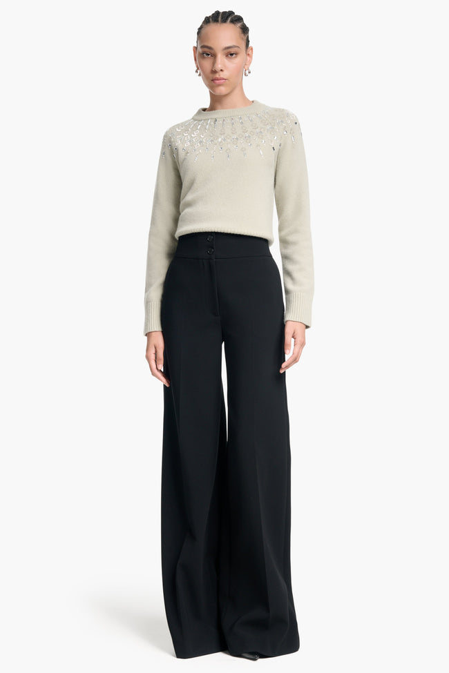 The Harold sweater is embellished with glistening crystals around the neckline. It's made from soft virgin wool with ribbed trims. Wear yours with everything from jeans to mini skirts.