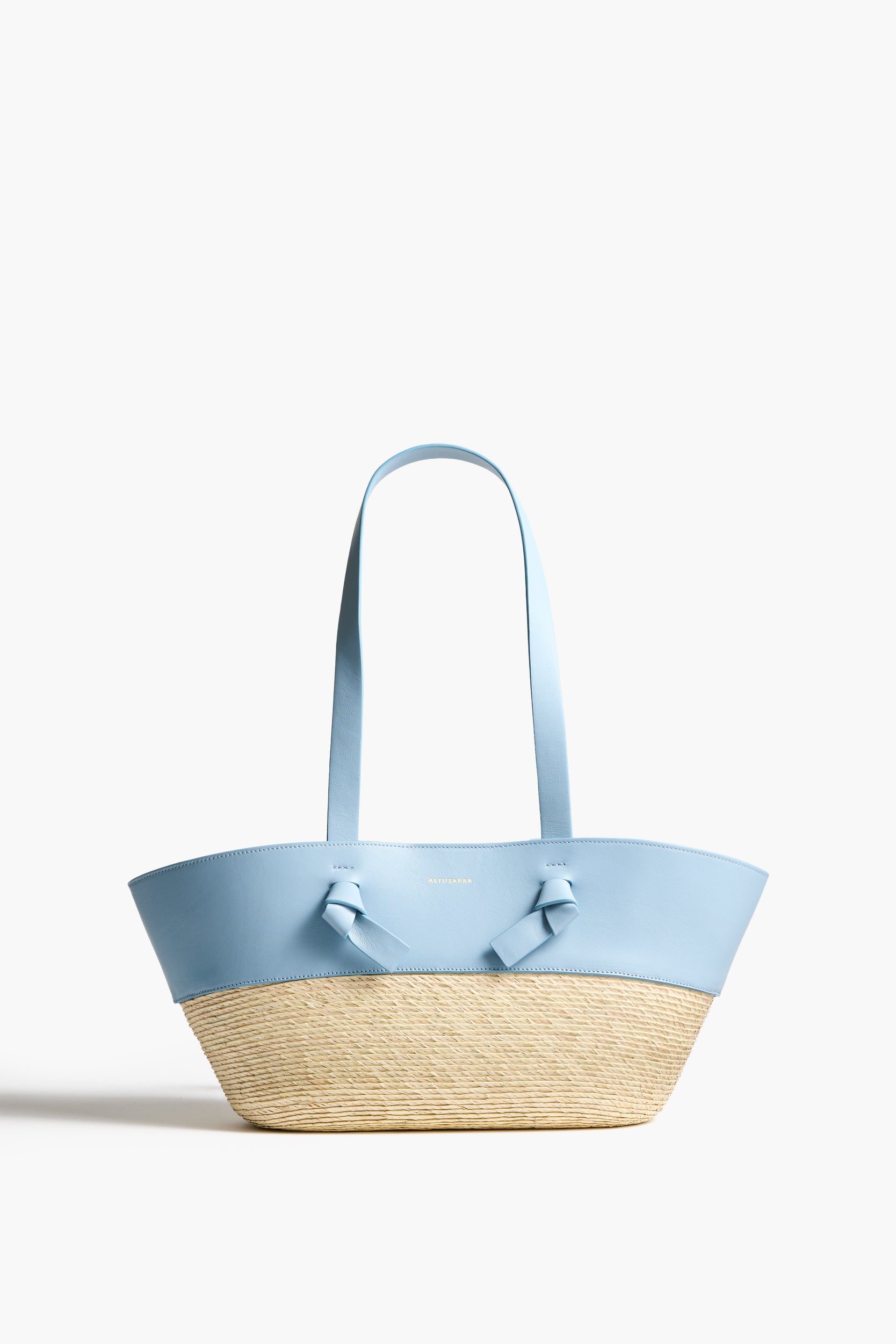 The small Knot basket bag is the ultimate transitional accessory. It's made in Spain with a woven raffia base which is contrasted by a blue leather top panel. Note the shoulder straps finished with knotted ends.