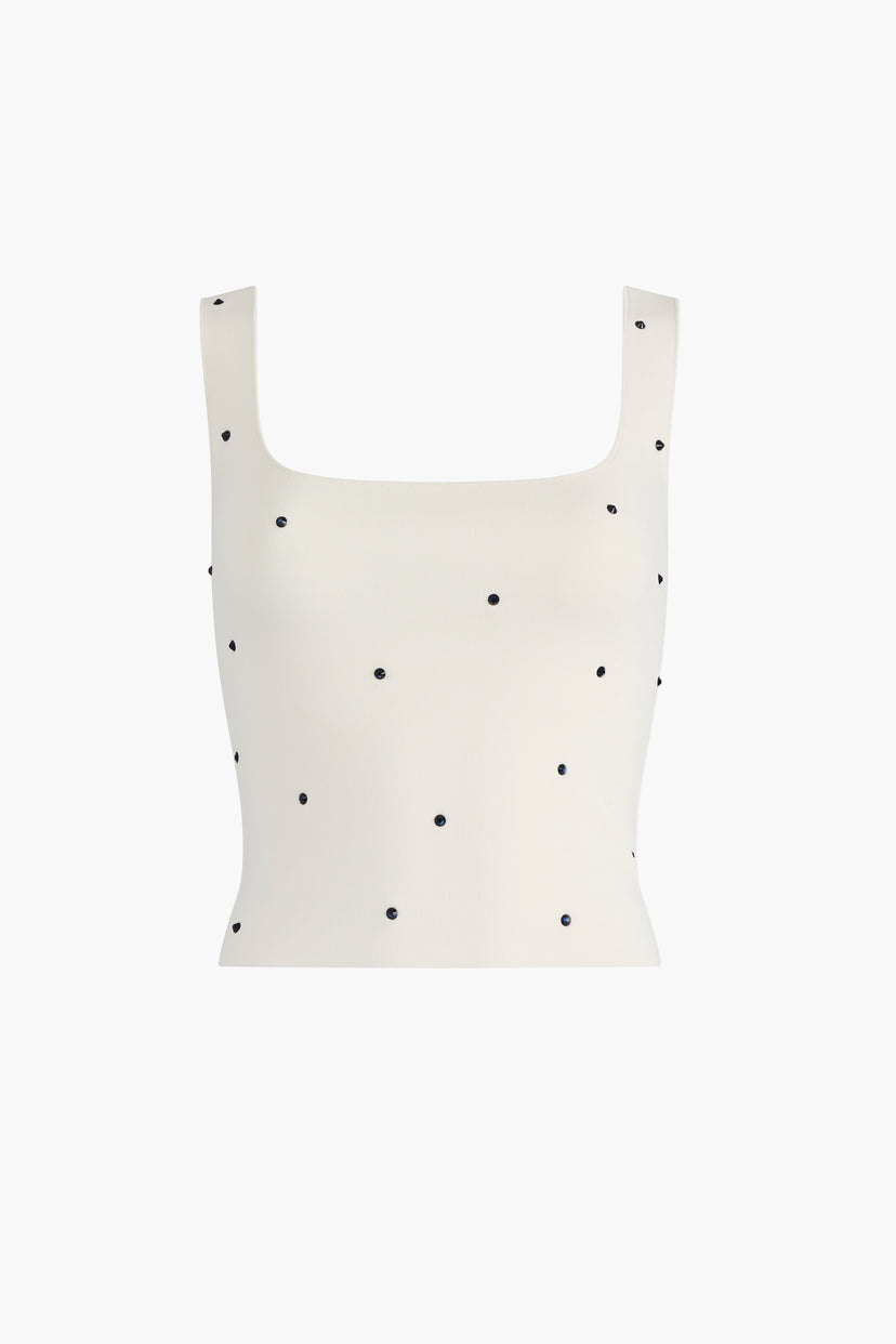 The Baz Top is subtly embellished with shimmering crystals that instantly elevate the classic shape. Knit from viscose, wear with the Dorrie as a twinset.