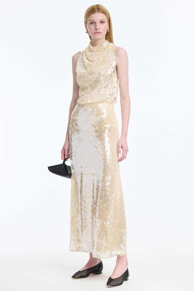 The Sleary top is a signature Altuzarra silhouette with a cowl neck inspired by a scarf. The intersection of elegance and polish, this iteration is fully embellished with glistening sequins - perfect for party season.