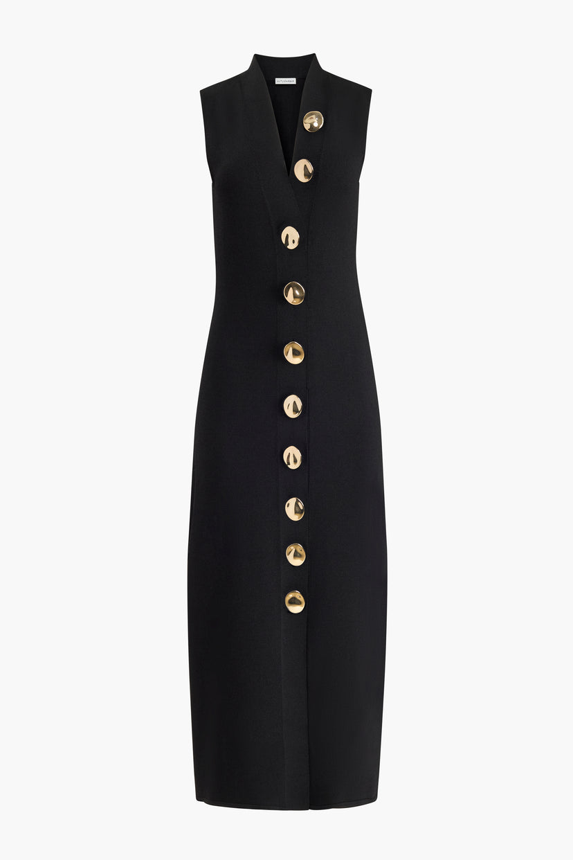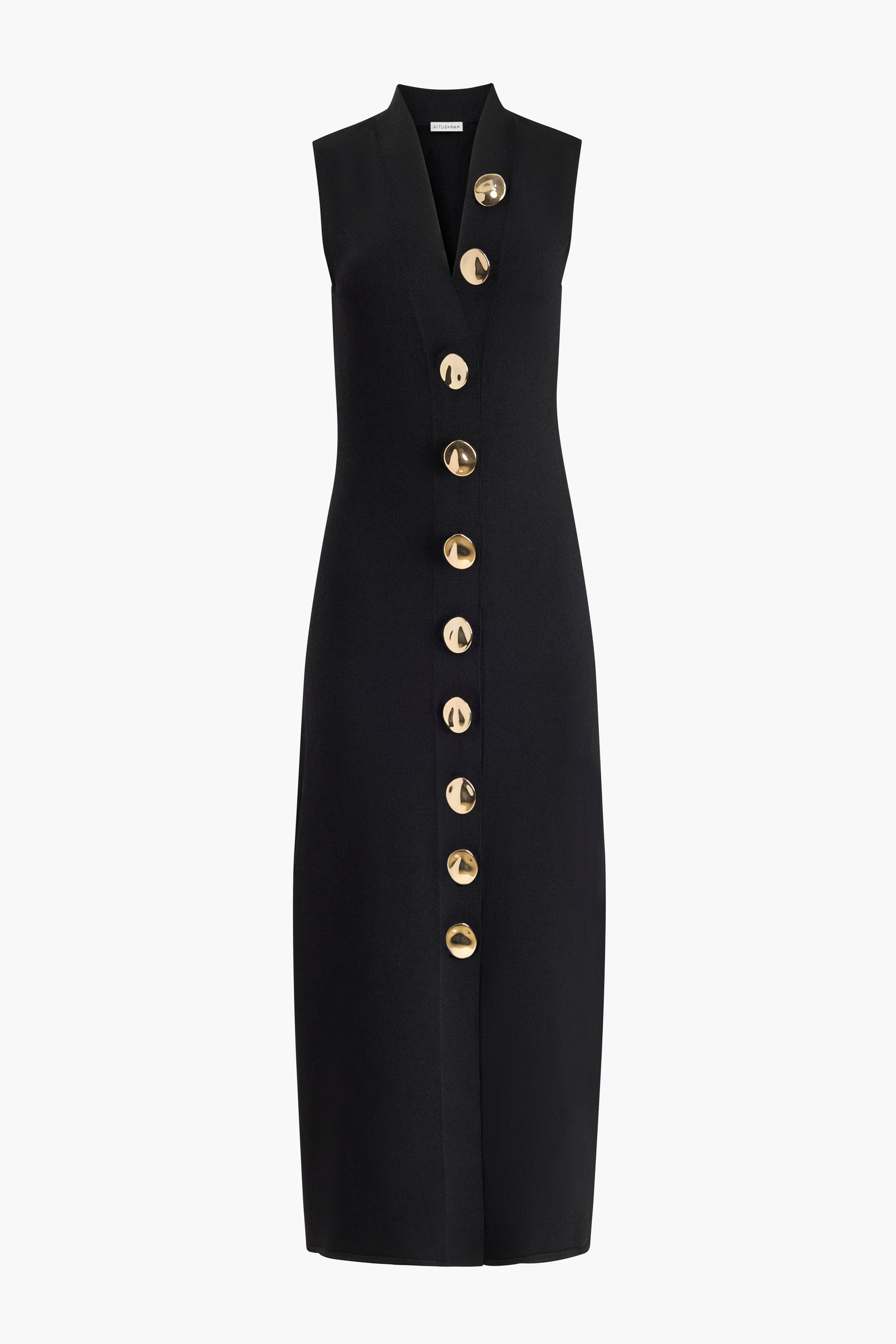 The Axia Dress is defined by a clean, elongated silhouette. Designed with a deep V neckline and a sleeveless cut, it features a straight fit that falls to a maxi length, finished with polished gold-tone buttons running down the front.