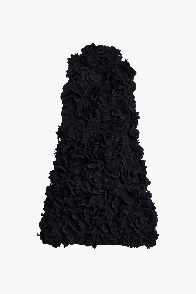 The Sigourney Top is crafted with an all-over three-dimensional floral appliqué that creates a sculptural, textured silhouette. Designed with a high neckline and a sleeveless cut, it falls straight through the body for a clean, structured shape.