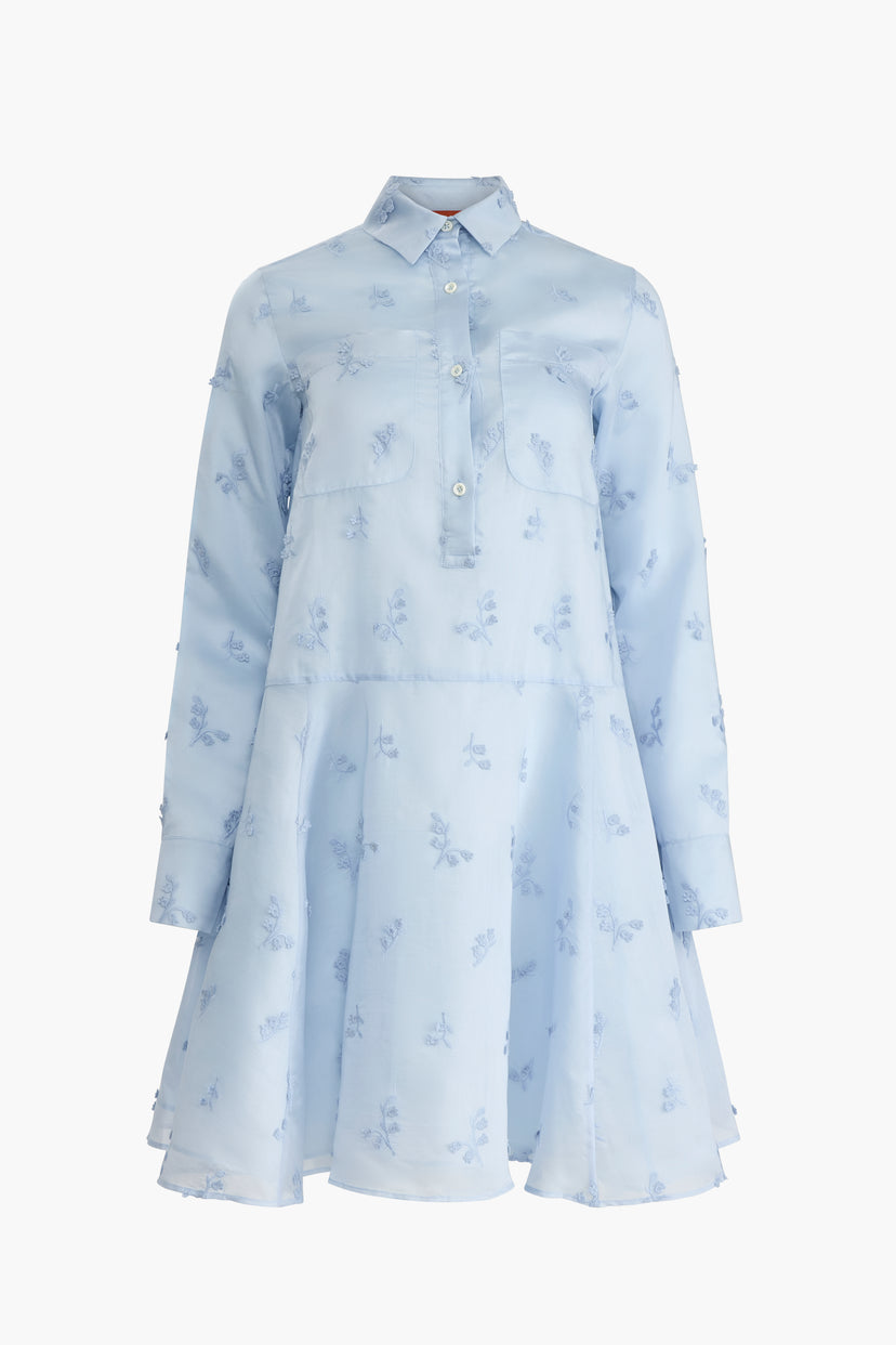 The Carmel Dress is a shirt-inspired style with a relaxed silhouette and softly flared skirt. It features a pointed collar, partial button placket, two chest patch pockets, and long sleeves with buttoned cuffs. A gathered seam at the waist creates volume through the skirt, while tonal embroidered floral motifs add subtle texture throughout.