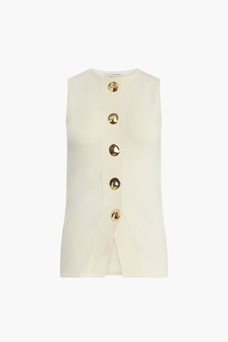 The Happer Top is designed with a sleeveless silhouette and a round neckline. It features a front button closure with gold-tone buttons and subtle shaping through the waist.