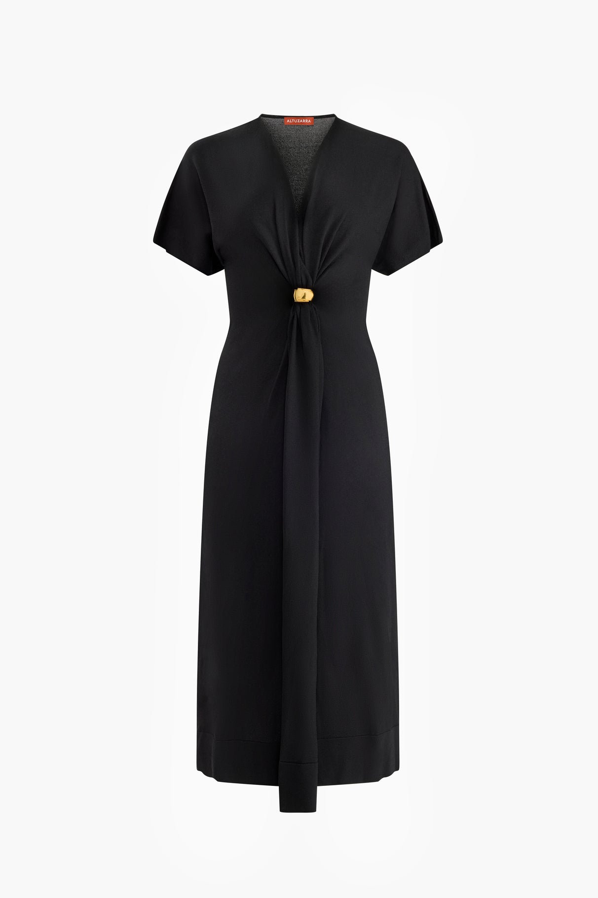 The Rene Dress is designed with a V-neckline and short sleeves. Soft draping at the waist is secured with a gold-tone hardware detail, creating subtle shaping through the body.