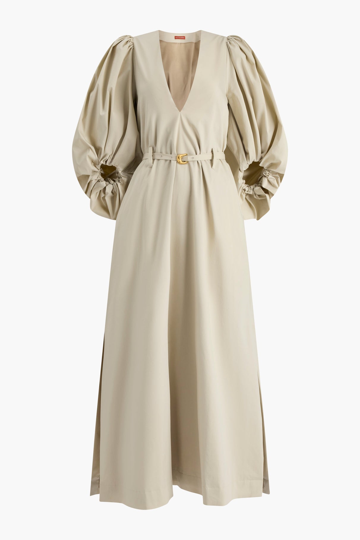 The Corrie dress is the perfect transitional piece. Shaped from cotton to a maxi silhouette with voluminous sleeves, it's finished with a waist-cinching belt.
