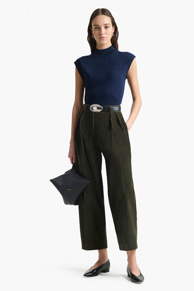 The Gabe sweater is a chic and minimal design. It's made from a sumptuous silk and merino blend with capped sleeves and a cozy turtleneck. Tuck yours into tailored trousers or a voluminous skirt.