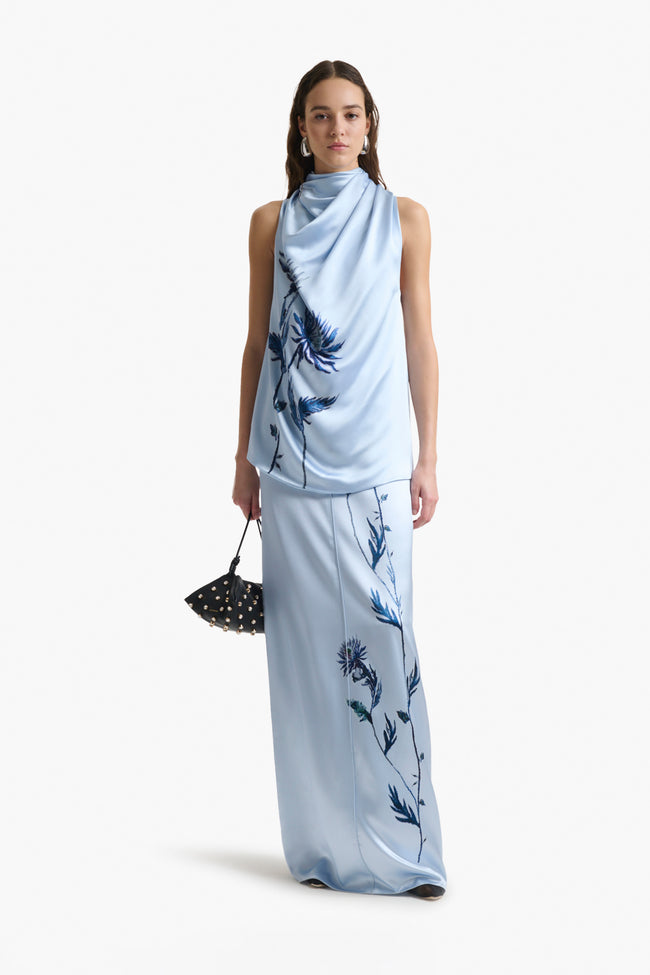 The Kat Skirt is a statement style. It's beautifully made from baby blue silk then decorated with a Shibori flower. The pencil silhouette falls to a maxi hemline, simply add point toe pumps.
