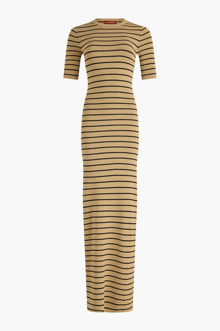 The Kitty dress maxi dress is fitted with horizontal stripes. It's knitted for a figure-hugging fit with short slim sleeves.