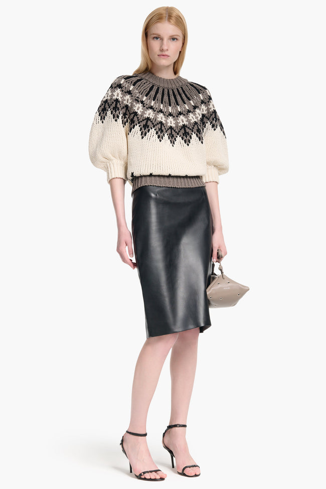 The Marty sweater is designed with a traditional Fair Isle pattern. Knitted from a soft Mako cotton, typically used for its exceptional fineness and silky feel, it's shaped for a looser fit with half balloon sleeves.