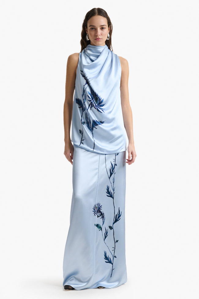 The Sleary top was featured on the FW25 runway. The pure silk silhouette is shaped to a high neck that elegantly drapes. Take cues from the show by wearing it with a maxi coat.