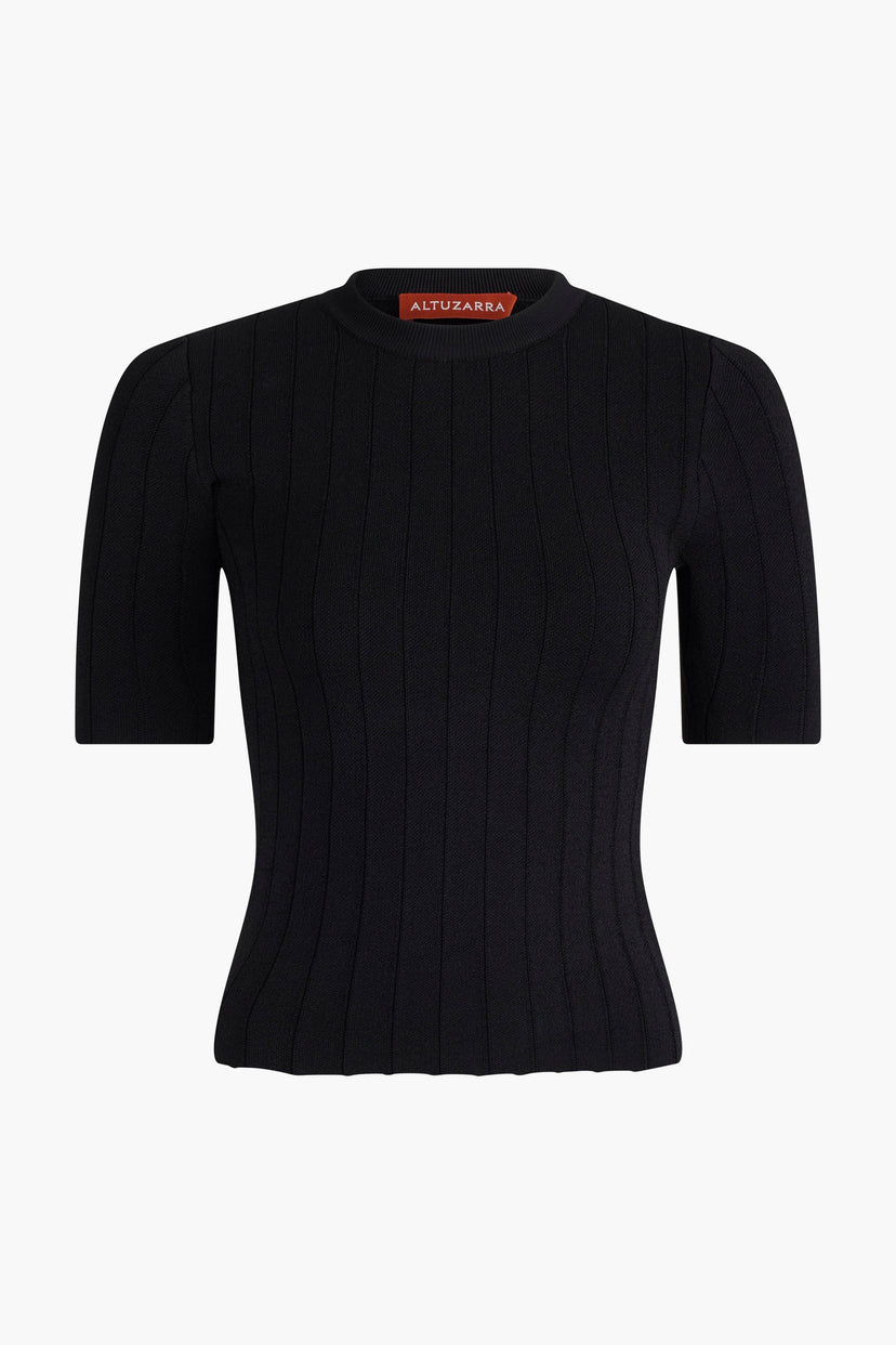 The Sparky top is knitted to a close-fitting silhouette with a round neck and short sleeves. The ribbed finish brings textural interest to this minimal design.