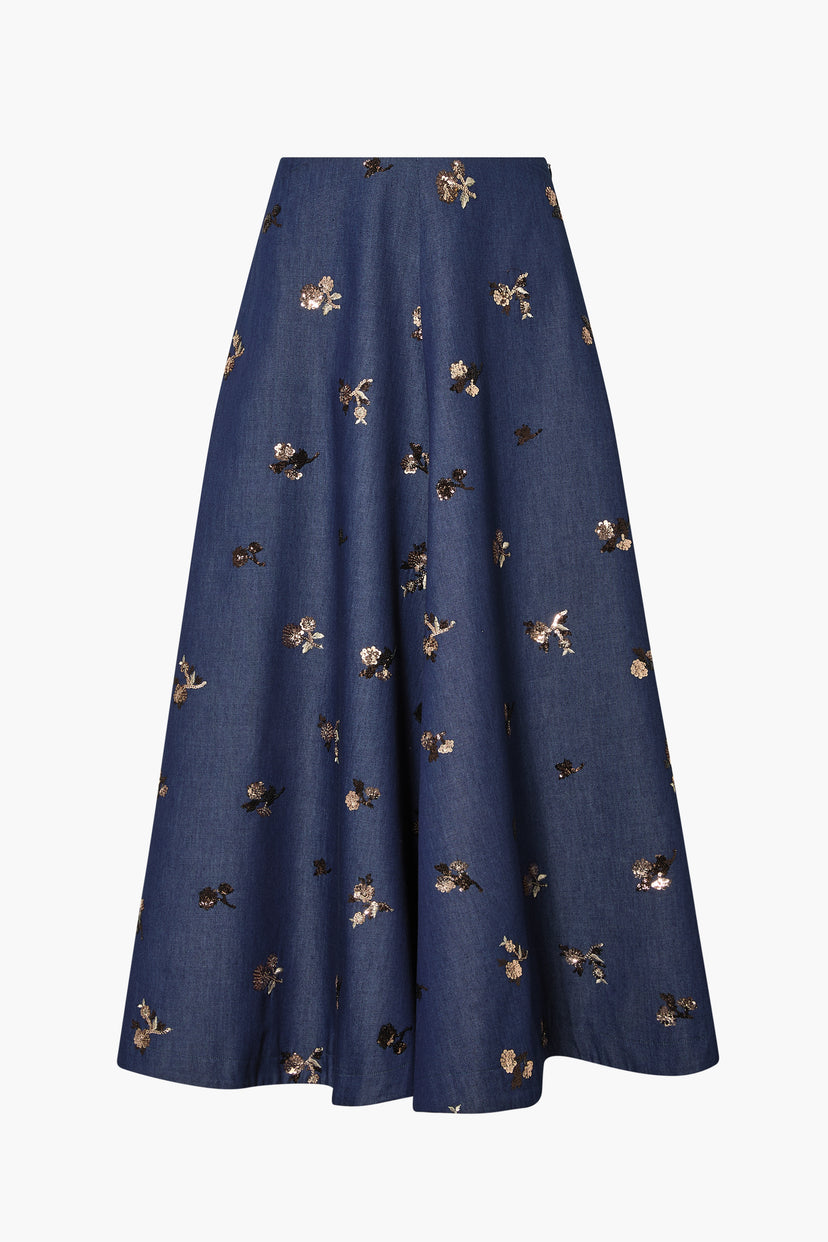 The Varda skirt is a signature Altuzarra style. The A-line midi shape sits at the natural waistline and fastens at the back via a concealed zip. The style is embellished with sequin and thread embroidery in a delicate floral motif.