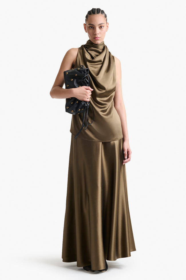 The Ames skirt is cut to a voluminous and maxi silhouette. The silky material elegantly drapes creating a flattering shape.