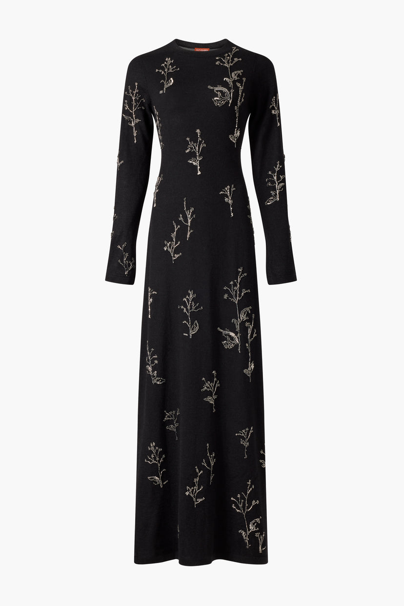 The Bozka Dress is shaped from a luxurious blend of lama and mulberry silk. The understated, maxi silhouette is embellished with silver beads shaped to depict branches and leaves.