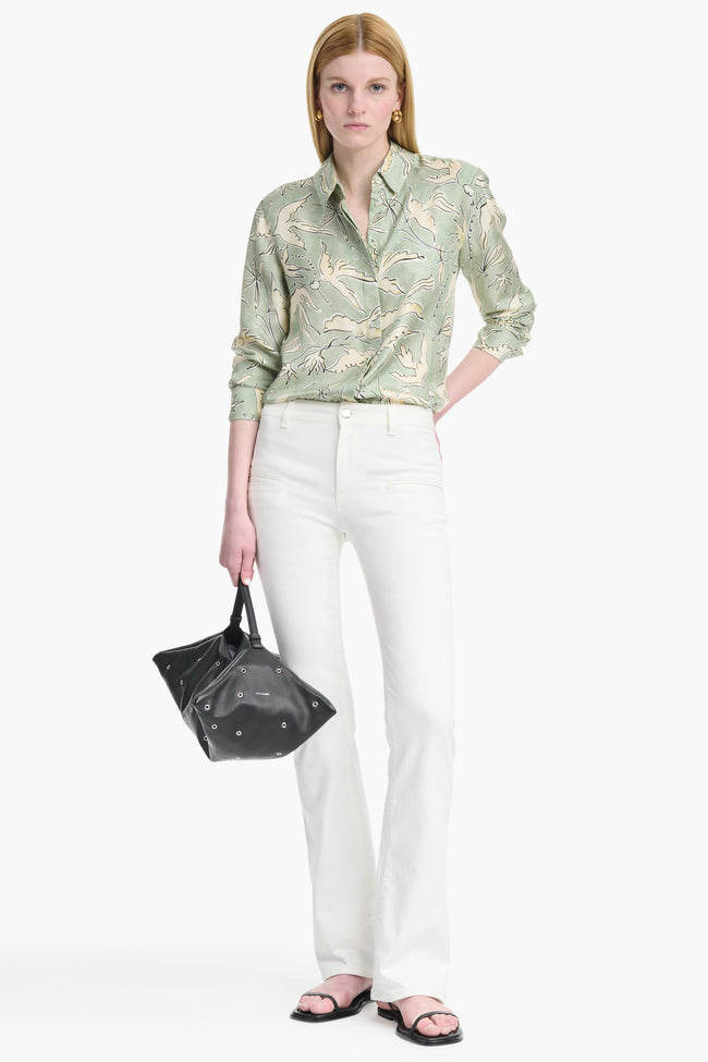 The Chika top is a signature style made from silk. Capturing an easy elegance, the relaxed design features a small point collar and a concealed button front closure.