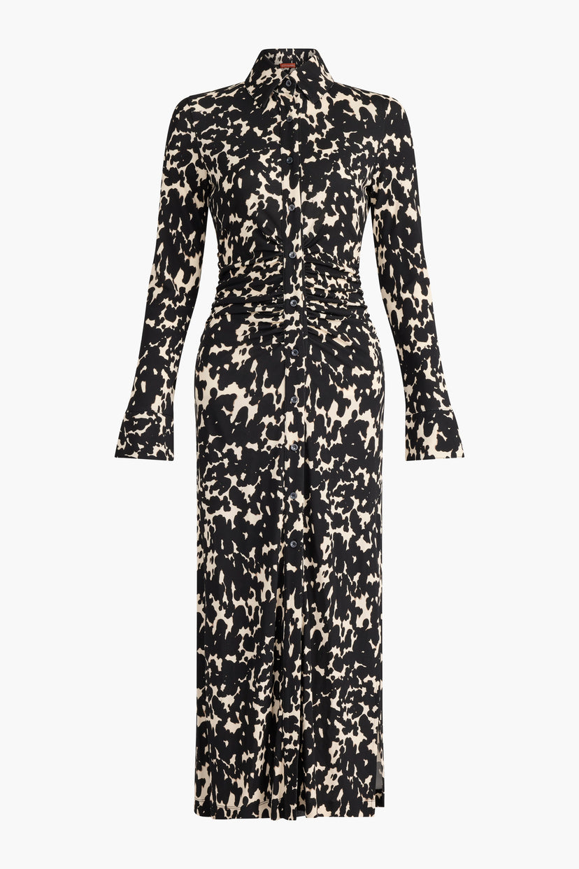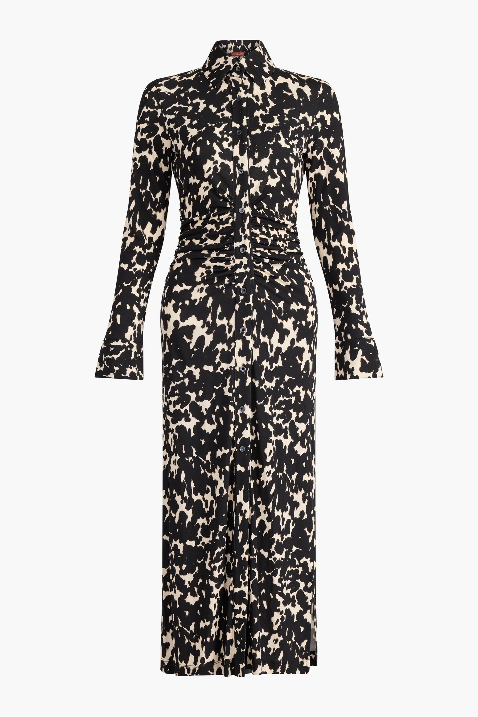 The Claudia Dress is cut from jersey for a slim fit with waist-flattering ruching at the hips, complete with side slits. This season it features an inky tortoiseshell print which was inspired by Altuzarra's own keepsake box.