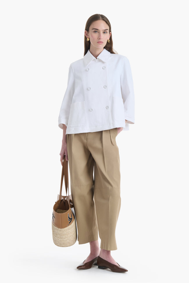 The Hayden Jacket is designed with a structured silhouette, featuring a pointed collar, three-quarter sleeves, and a double-breasted front with button closures. It is finished with two front patch pockets.