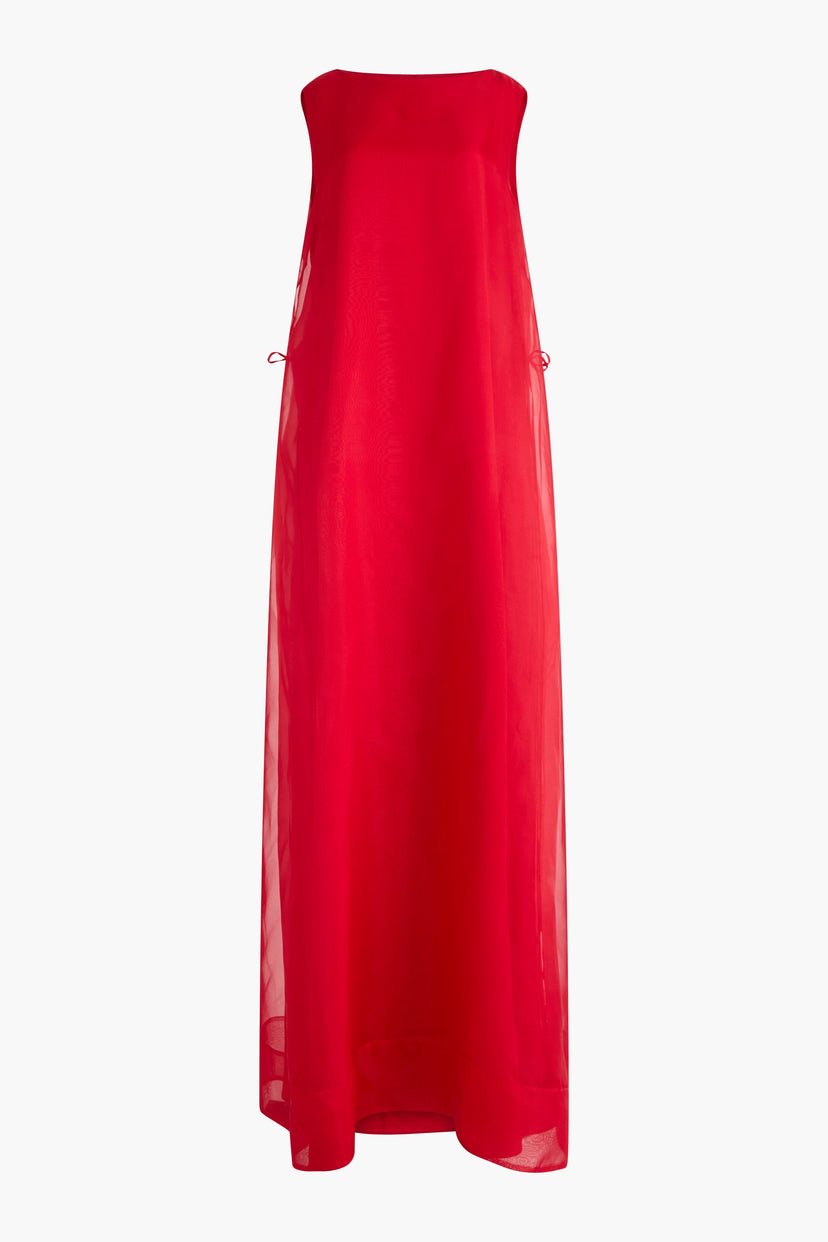 The Jools dress made a dramatic entrance on the FW25 runway where dresses play with transparency. This billowy, nightgown-esque design is shaped from pure silk and imagined in a bold grenadine red hue.