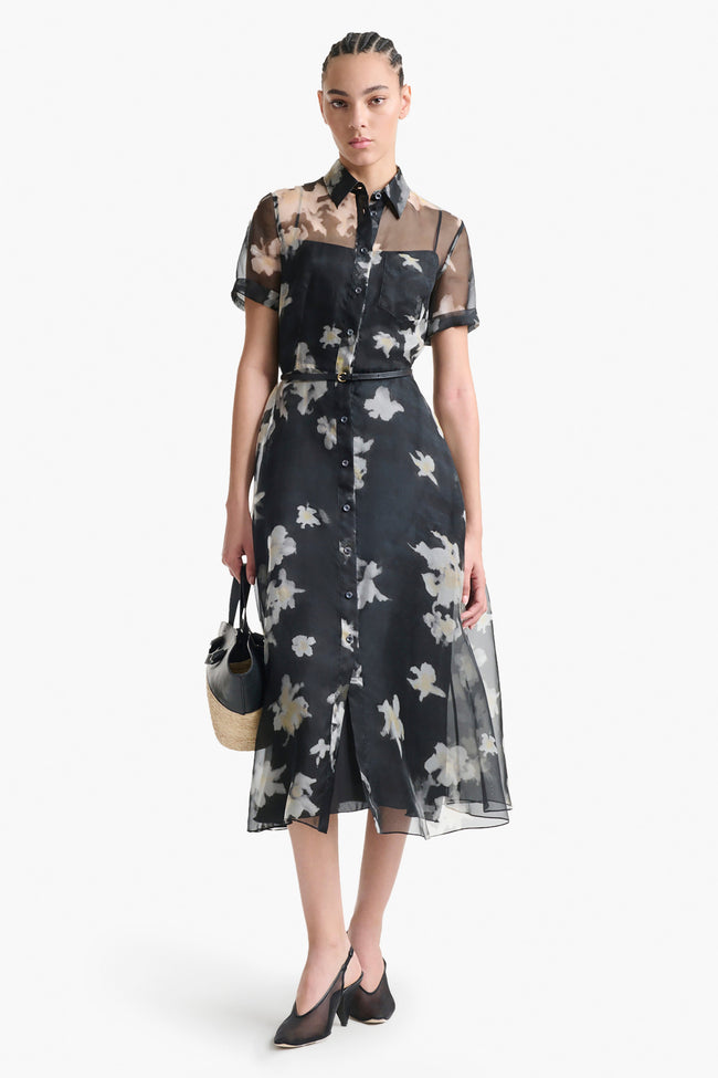 The Kiera dress features an airy A-line silhouette. Designed with a small point collar and short sleeves, it's detailed with a slim leather waist belt.