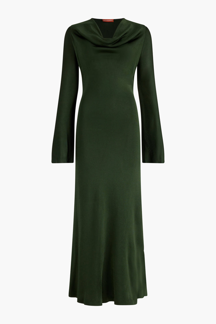 The Milda dress was first seen on the FW25 runway where sculptural cowl necks nod to matadors, a continuation of the Spanish inflection from last season. Shaped with long sleeves to a maxi silhouette, style it with flats and a statement bag.