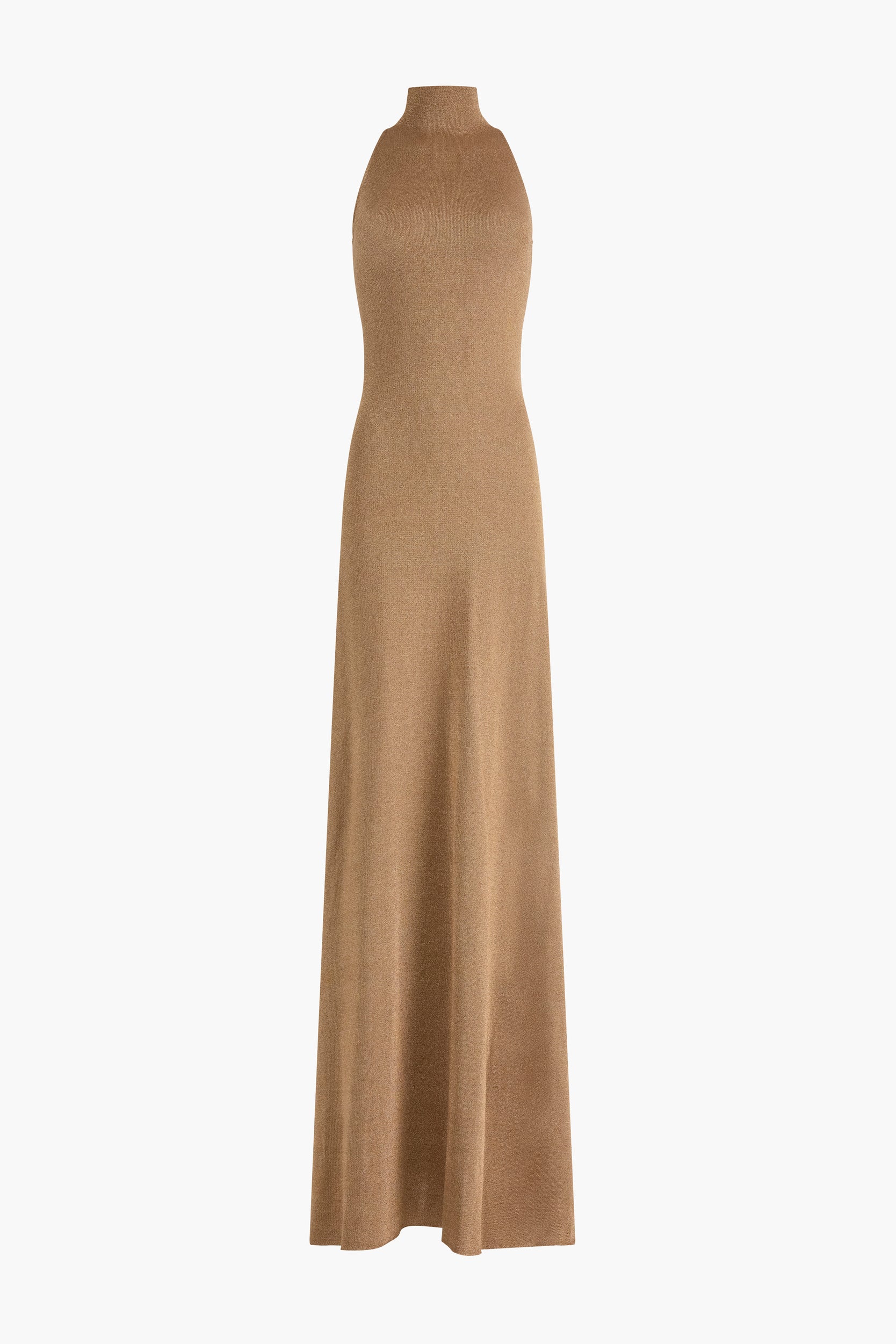 The Mitzi Dress has a dramatic maxi silhouette with a turtle neck. It's beautifully shaped to a close-fitting silhouette from viscose jersey that has a metallized fibre running through for a subtle sheen.