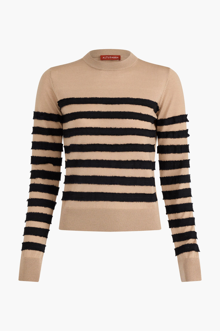 The Skippy sweater is aptly named thanks to the maritime stripes and neutral hue. It's made from a luxe blend of merino and silk with ribbed knit trims.